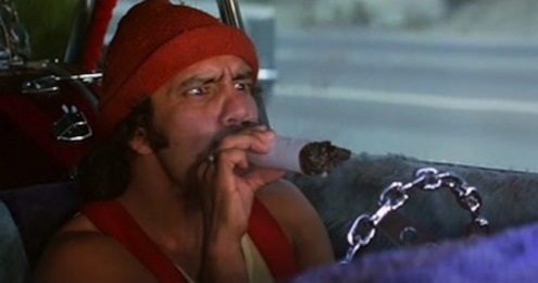 The movie is at its most gloriously dopey when it limits itself to car banter between Pedro DePacas (Marin) and the obliquely named “Man” Stoner (Chong). Chong pulls out a blunt the size of a small dirigible. He explains that it includes a fair amount of “Labrador“; his dog ate his stash and so Man had to follow the befuddled pooch around for three days with small baggies to retrieve it.